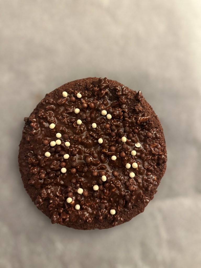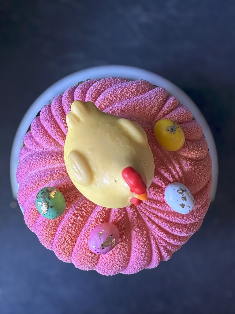 Questo dolce é formato da una base spugnosa di biscuit al cacao, Croustillant di granola , cioccolato fondente, pralinato di mandorle e palline ai cereali, da un inserto formato da una mousse al caramello, una mousse al cioccolato fondente, da una parte esterna di cremoso alla vaniglia , e da una finitura spray chablonage effetto velluto fucsia e giallo