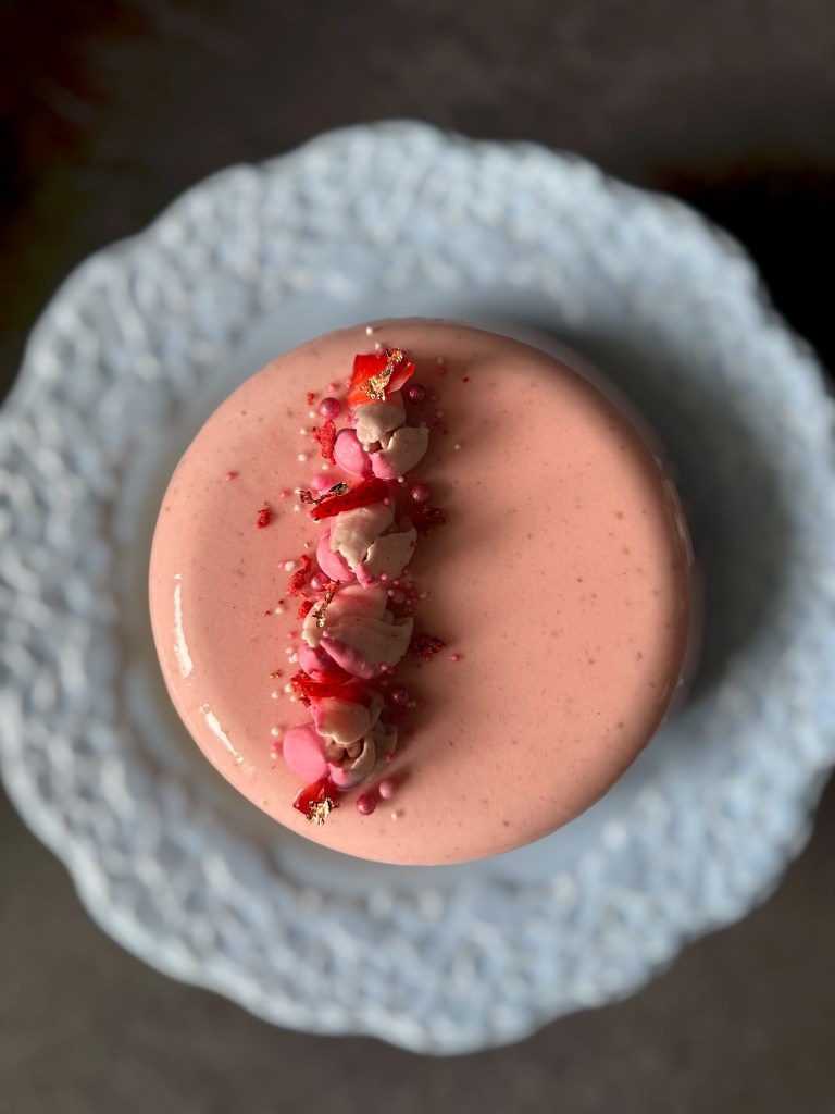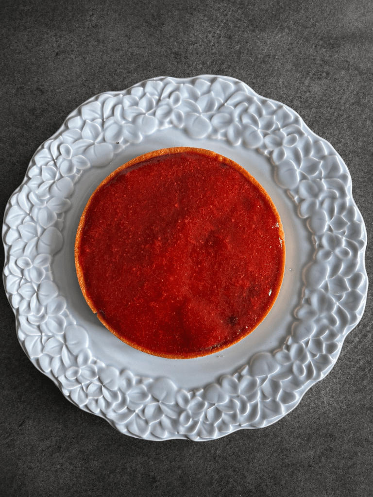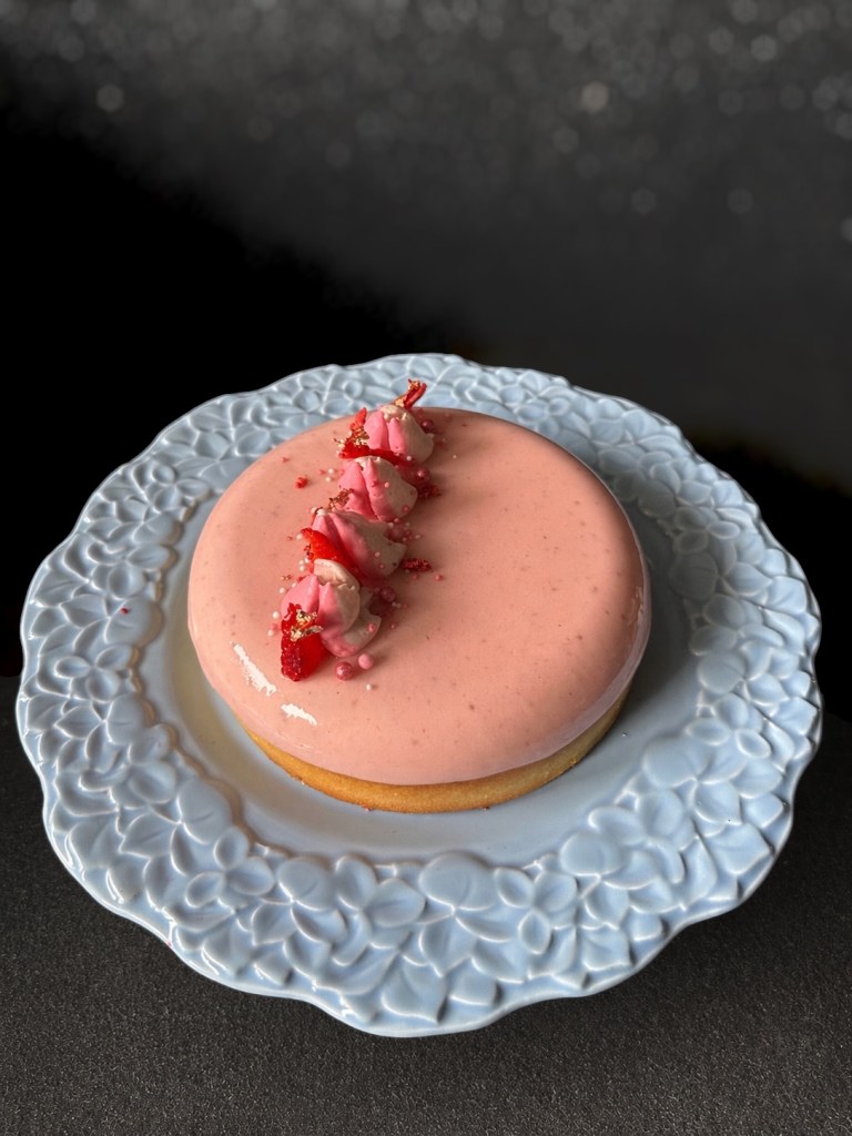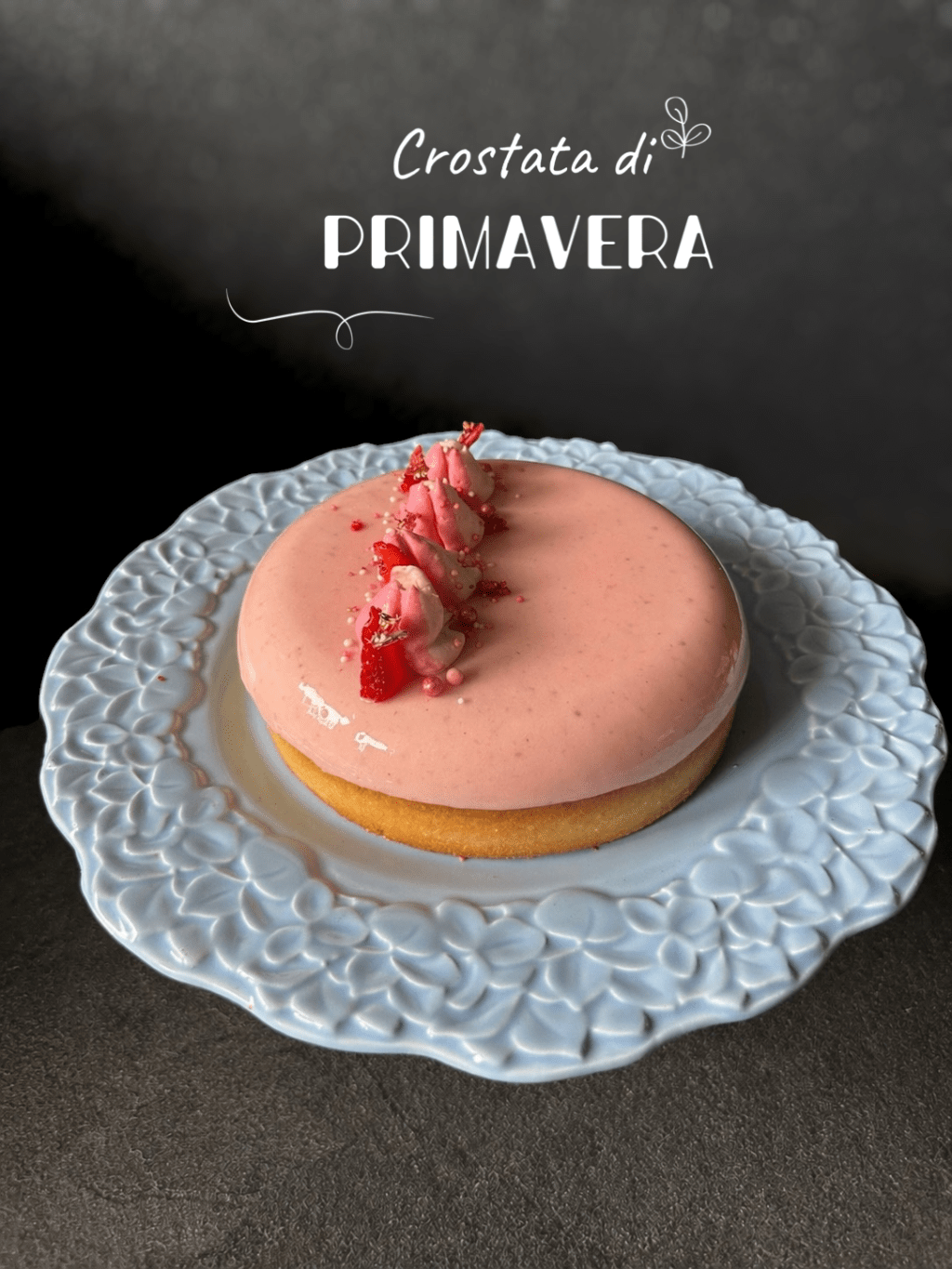 Questa crostata è formata da una pasta frolla alle mandorle , un biscuit al cacao , una confit di fragole una cupola allamousse alle fragole , una glassa trasparente una ganache montata alle fragole
