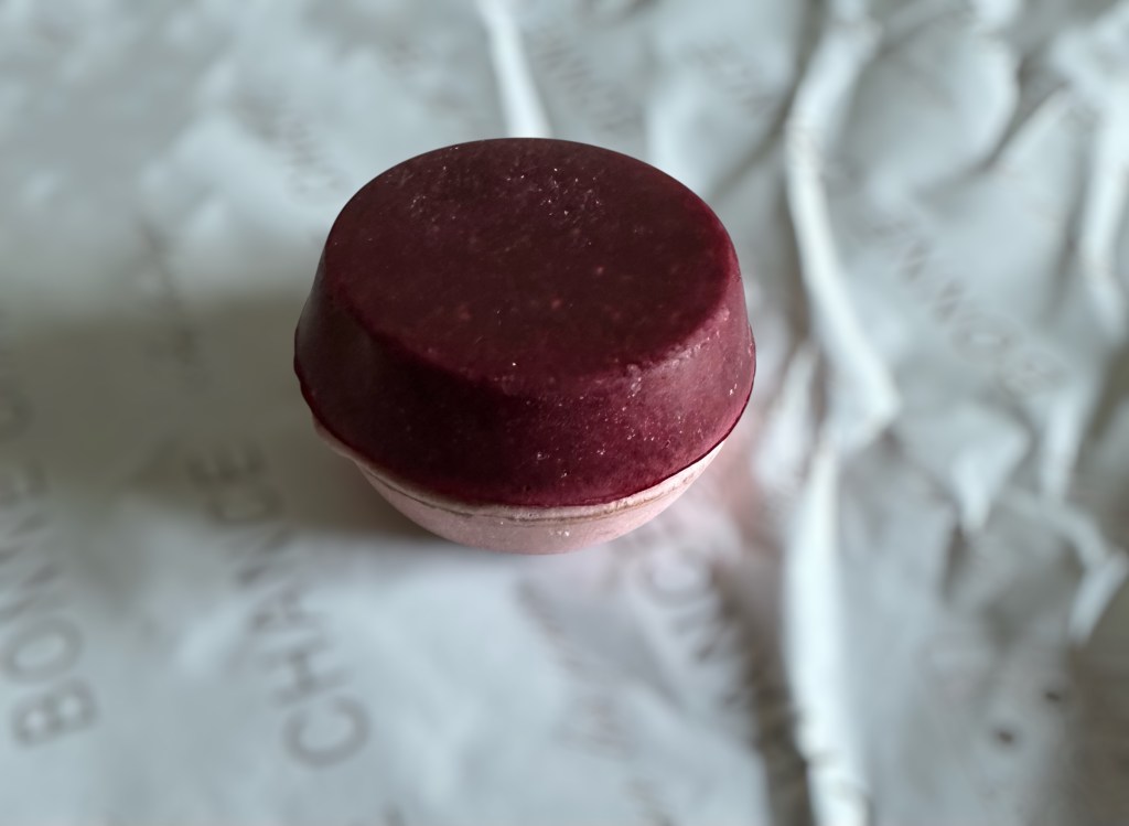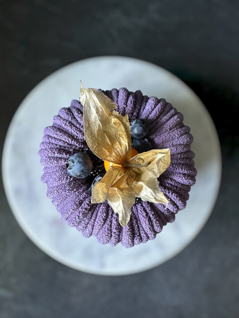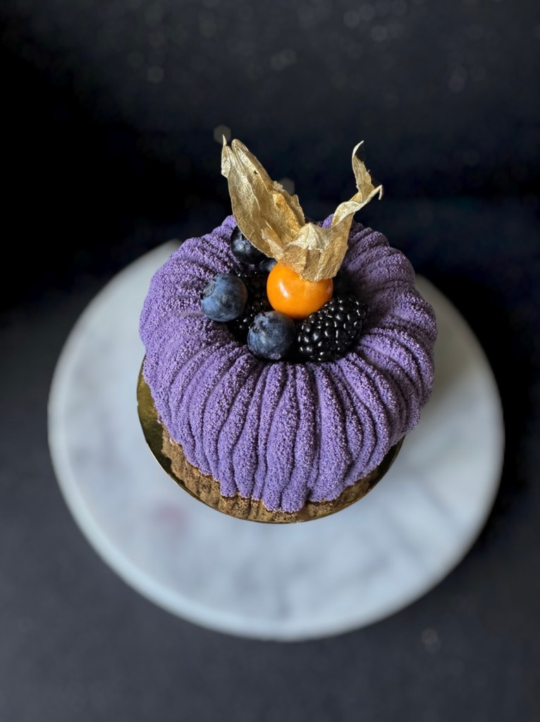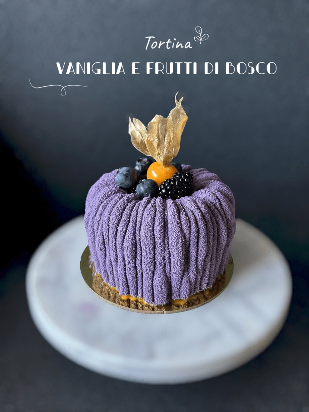 Questo dolce é formato da una base spugnosa di biscuit al cacao , da un inserto formato da una mousse alle fragole, un gelé ai frutti rossi,, da una parte esterna di cremoso alla vaniglia e da una finitura spray chablonage effetto velluto viola